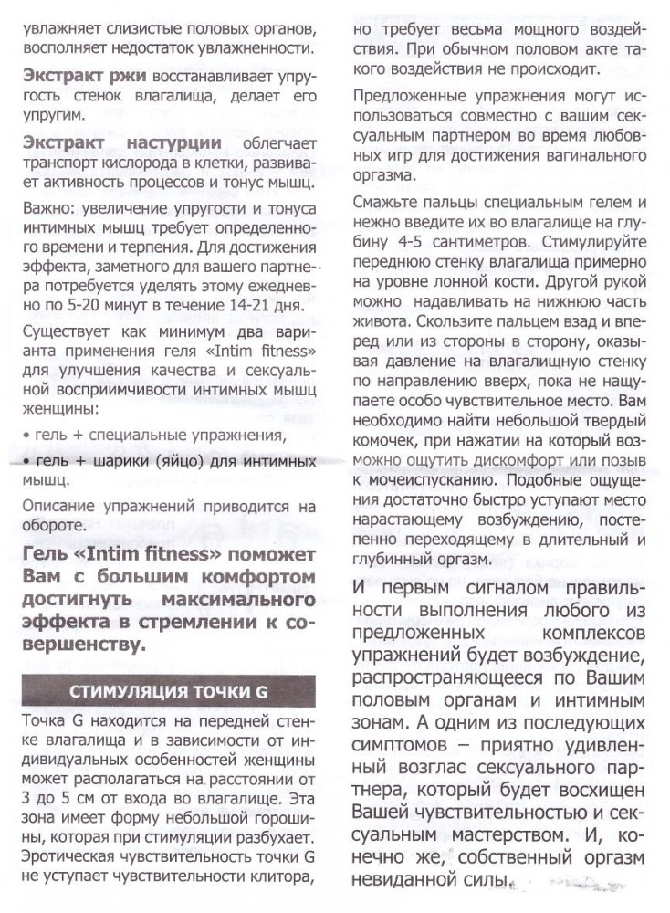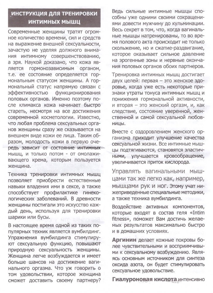 Гель для женщин. Для тренировки интимных мышц. Приятные и легкие упражнения по 5-15 минут в день. Активное кровоснабжение органов малого таза . Собственный оргазм невиданной силы. Новый арсенал методов доведения мужчины до экстаза. Воздействие активных компонентов Аргинин - повышает чувствительность и способность к сексуальному возбуждению. Экстракт настурции облегчает поступление кислорода в клетки , активизирует обменные процессы и повышает тонус мышц . Гиалуроновая кислота - интенсивно увлажняет , помогая предотвратить потерю влаги . Экстракт ржи - восстанавливает мускулатуру влагалища, делает его упругим. Упражнения для тренировки прилагаются.