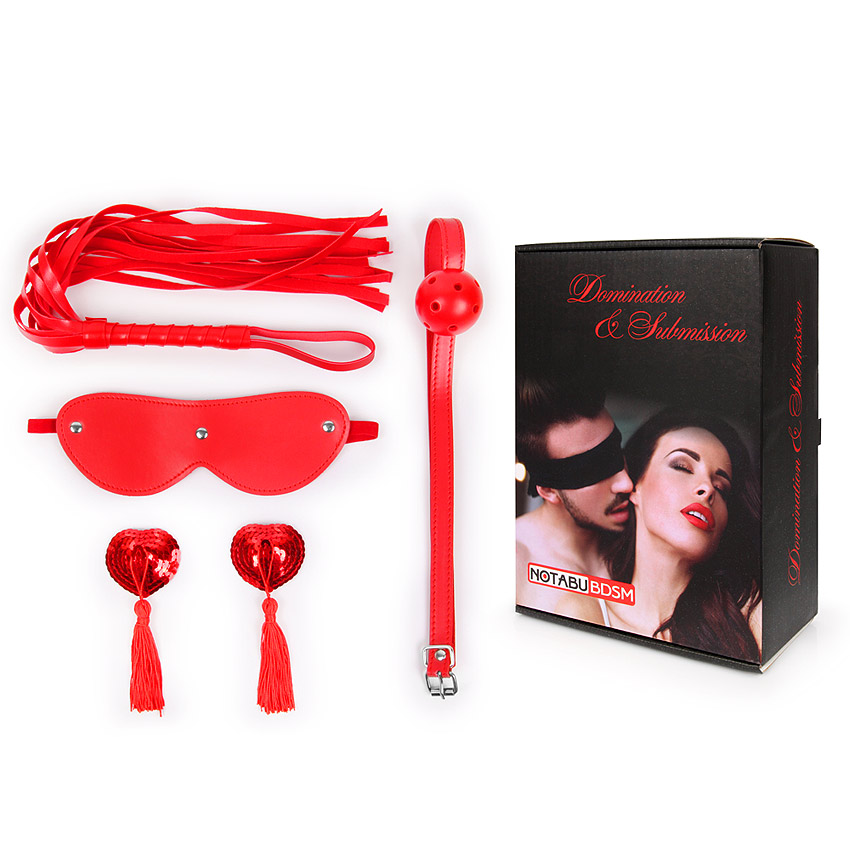 НАБОР (маска, кляп, пэстисы, плётка) цвет красный . Великолепный набор аксессуаров для любителей БДСМ-игр. В комплект входят плеть, кляп, маска и пэститы для украшения сосков. Плеть - флогер состоит из длинных хвостов и удобной рукоятки с петлёй для наматывания на руку или подвешивания на крючок. Кляп оснащён шариком с отверстиями для дыхания. Набор упакован в презентабельную коробку, которая будет прекрасно смотреться на витрине.После использования БДСМ аксессуаров рекомендуется обработать очищающим спреем с антимикробным эффектом