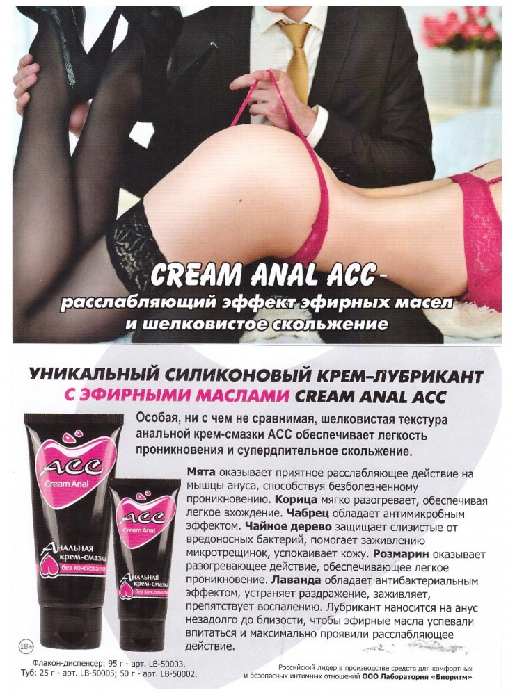 Уникальный силиконовый крем-лубрикант с эфирными маслами для двоих . Силиконовая основа обеспечивает длительное скольжение , а эфирные масла способствуют расслаблению мышц ануса оказывая антибактериальное , заживляющее и дезодорирующее действия. Совместим с изделиями из искусственных материалов. Применение : желательно наносить крем-лубрикант на анус незадолго до близости , что бы эфирные масла успели впитаться в кожу и слизистую и проявить максимальный расслабляющий эффект. Упаковка : флакон-диспенсер 95 гр. Страна Россия. Производитель: Лаборатория Биоритм.
