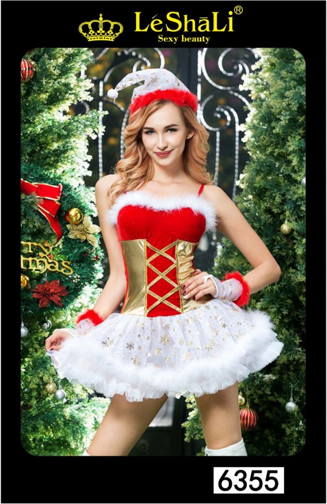 Мини платье приталенного силуэта из стрейч велюра со вставками из металлизированной лайкры на съемных регулируемых по длине бретелях. Без застежки. По линии груди отторочено опушкой из лебяжьего пуха. Низ выполнен в виде трех воланов из органзы и украшен лебяжьем пухом и принтом в виде золотистых снежинок. Полочка платья украшена переплетением из тесьмы в виде корсетной шнуровки с россыпью блесток. В комплект входят: колпачок и перчатки с открытыми пальчиками с отделкой из лебяжьего пуха, трусики- стринги. Размер:44-50